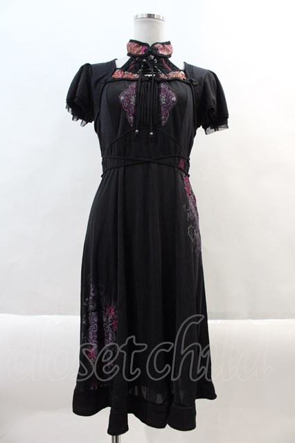 Ozz oneste / フロント編み上げ半袖ワンピース 黒XボルドーX紫 I-24-11-01-074-OO-OP-HD-ZT111 [戻る]