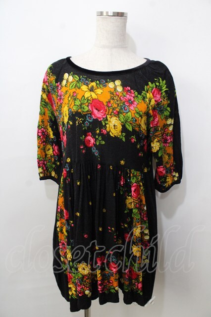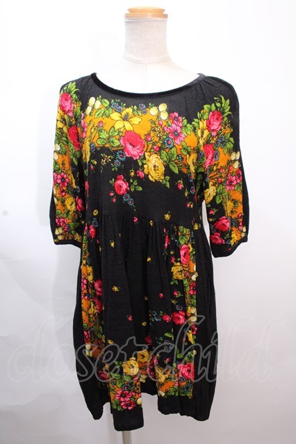 Jane Marple / 花柄カットソーワンピース M 黒 Y-25-09-13-077-JM-OP-SZ-ZT510