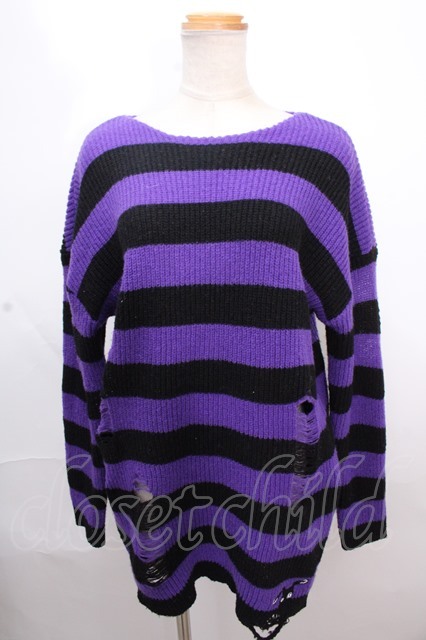 NieR Clothing / UNISEX STRIPE DAMAGE SWEATER F 黒×紫 Y-24-12-12-048-PU-TO-SZ-ZT095