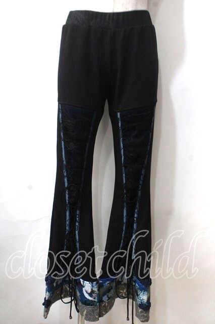 Qutie Frash / 編み上げ裾和柄ブーツカットパンツ 黒×青 Y-25-06-26-162-QU-PA-SZ-ZY