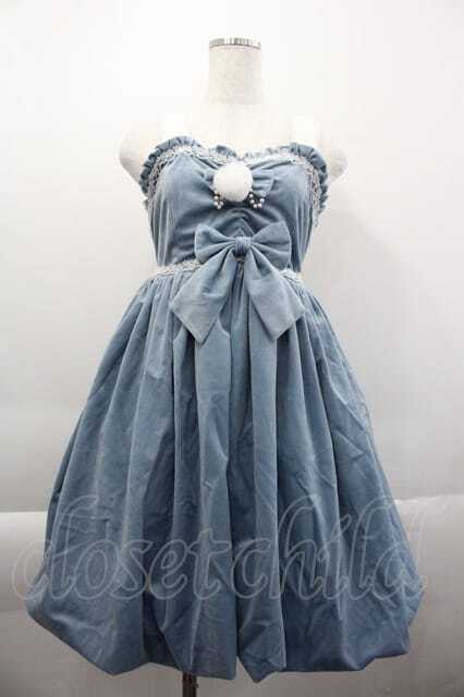 BUNNY・魔法森林・(海外ロリータブランド) / ファーリボン別珍ジャンパースカート サックスX白 I-25-04-10-052-LO-OP-HD-ZI