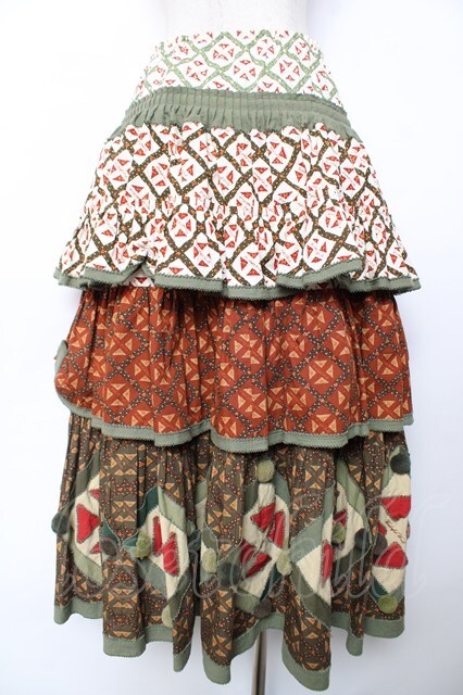 WONDERFUL WORLD / モチーフ付きパッチワークティアードスカート グリーン系 Y-25-12-08-094-LO-SK-SZ-ZY