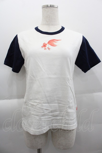 Powder / 金魚プリントTシャツ S 白X紺 I-25-04-16-028-LO-TO-HD-ZI