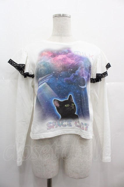 MILK / space catフリルカットソー 白X黒X青 I-25-07-09-032-ML-TO-HD-ZI