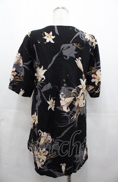 INGEBORG / 百合千鳥柄半袖チュニックブラウス 黒X白 I-25-08-04-023-LO-BL-HD-ZI
