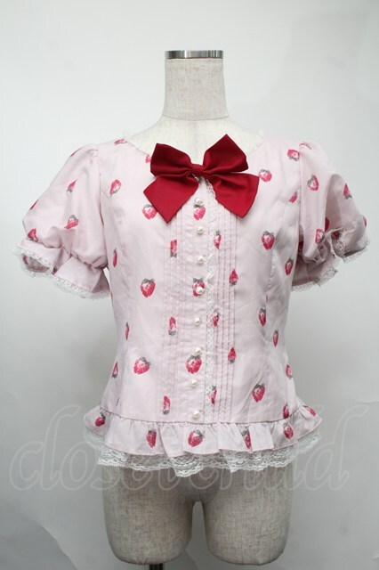 mille fille closet / ストロベリー柄ブラウス風カットソー ピンク S-25-08-09-040-LO-BL-HR-ZT349