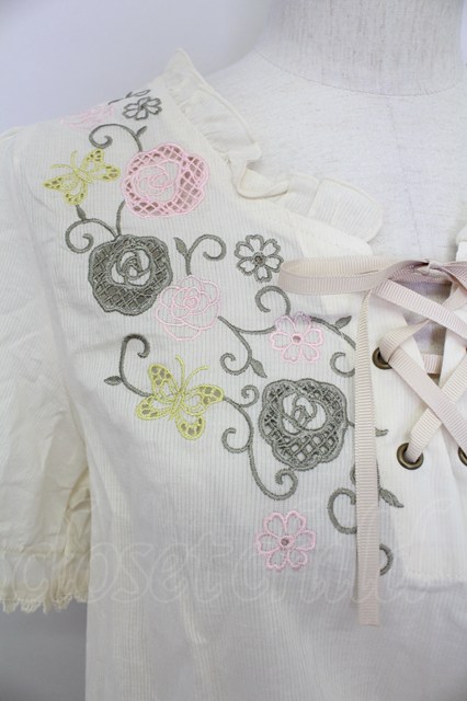 axes femme / 胸元刺繍編み上げトップス アイボリー T-25-08-12-002-AX-TO-SA-ZI [戻る]
