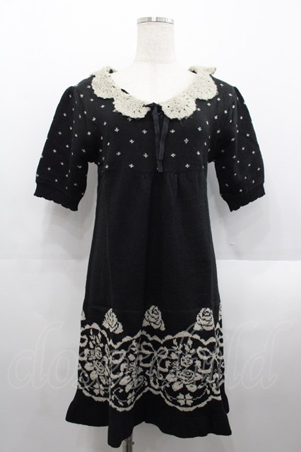 axes femme / 薔薇リボン柄ニット半袖チュニック クロ I-25-08-18-065-AX-OP-HD-ZI