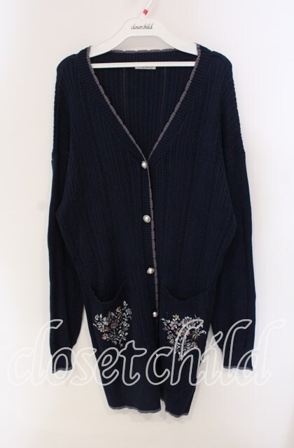 axes femme / 花刺繍ロングニットカーデ ネイビー O-25-09-11-086-AX-TO-IG-OS