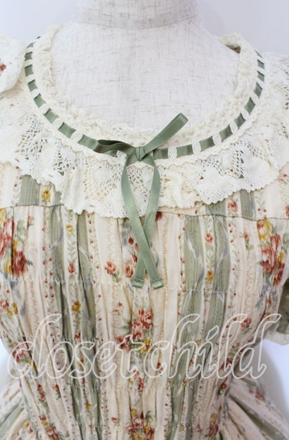 Innocent World / フラワーブーケシャーリングショートスリーブワンピース グリーン×生成り O-25-09-11-006-IW-OP-IG-OS [戻る]