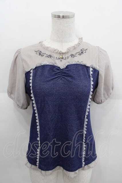 axes femme POETIQUE / マリン刺繍ビスチェ切替プルオーバー M グレー×インディゴ I-25-09-11-010-AX-TO-HD-ZI