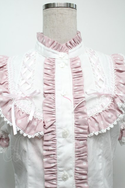 BABY,THE STARS SHINE BRIGHT / Milky Dot 立ち襟半袖ブラウス 白xピンク S-25-09-12-057-BA-BL-AS-ZS