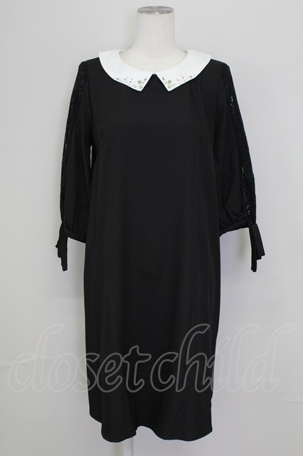 axes femme / ビジュー襟&レース切り替え袖ワンピース 黒X白 T-25-09-15-012-AX-OP-SA-ZI [戻る]