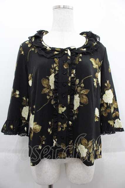 PINK HOUSE / 薔薇プリントブラウス 黒X白X緑 I-25-09-13-031-LO-BL-HD-ZT193