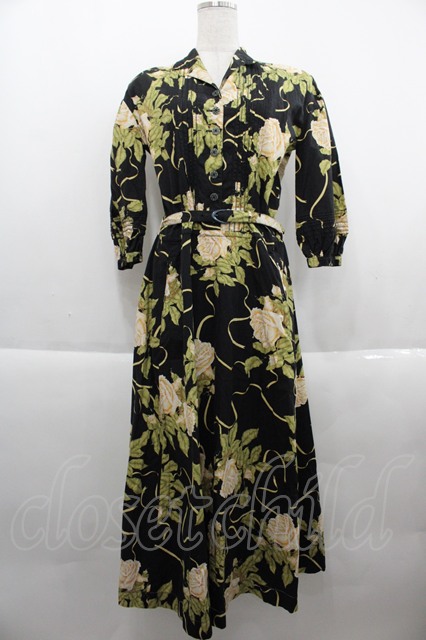 INGEBORG / 薔薇柄半袖開襟ワンピース ブラック I-25-09-21-078-LO-OP-HD-ZI