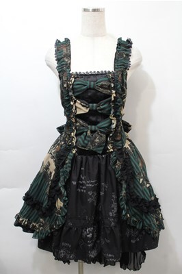 FRILL / アンティークテディベア柄ジャンパースカート 黒xグリーン S-25-10-17-056-HN-SK-HR-ZS