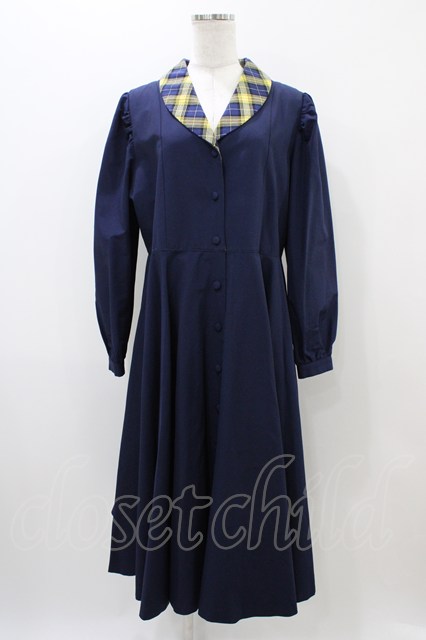 Perla nell' ostrica / ショールカラージャケットワンピース L ネイビー×?チェック H-25-11-01-1036-EL-OP-KB-ZH