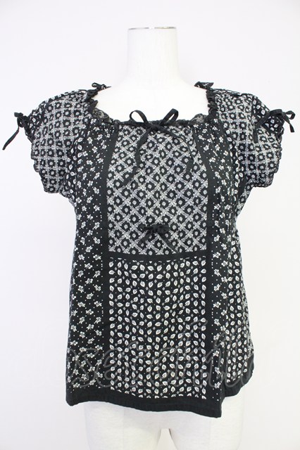 PINK HOUSE / パッチワーク風プリント半袖ブラウス 黒X白 T-25-10-30-016-LO-BL-SA-ZT