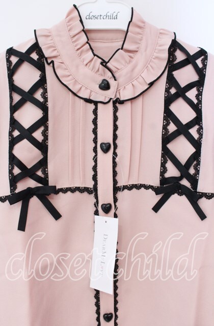 DearMyLove / レースアップフリル襟ブラウス L ピンク×クロ O-25-10-30-053-EL-BL-OW-OS