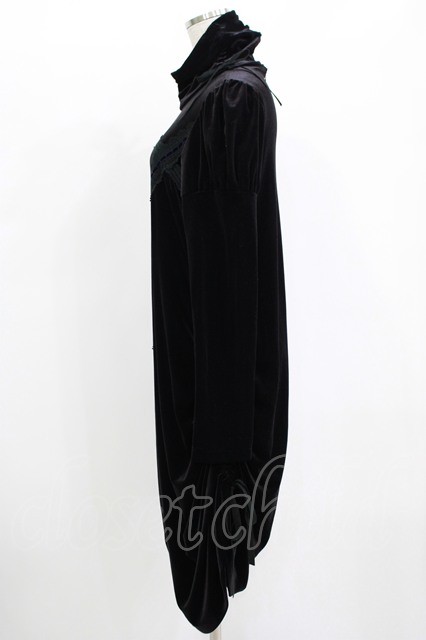 BPN / サイドギャザーベロアワンピース ブラック×ネイビーリボン H-25-11-09-1018-GO-OP-KB-ZH