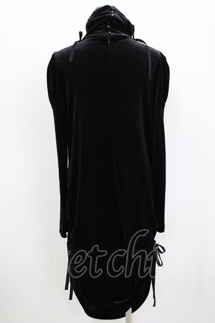 BPN / サイドギャザーベロアワンピース ブラック×ネイビーリボン H-25-11-09-1018-GO-OP-KB-ZH