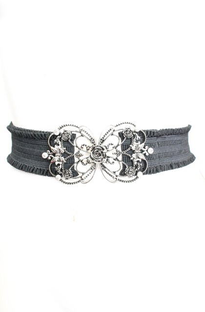 axes femme / 立体バラ×蝶ゴムベルト クロ×シルバー O-25-11-08-1019-AX-ZA-IG-ZT422-F001