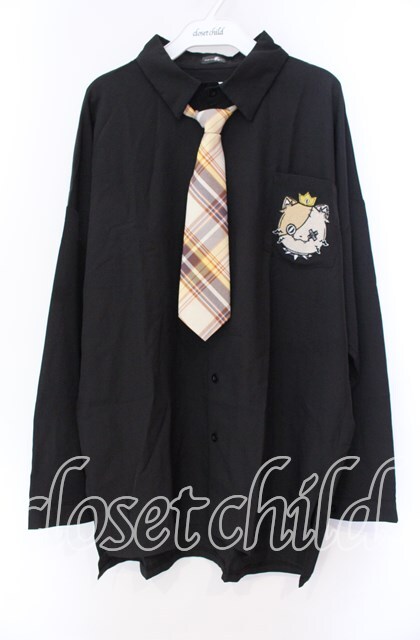 NieR Clothing / ミケ刺繍入りロングシャツ【ワンタッチネクタイ付き】 ブラック×ベージュ O-25-11-11-021-PU-BL-IG-ZT266
