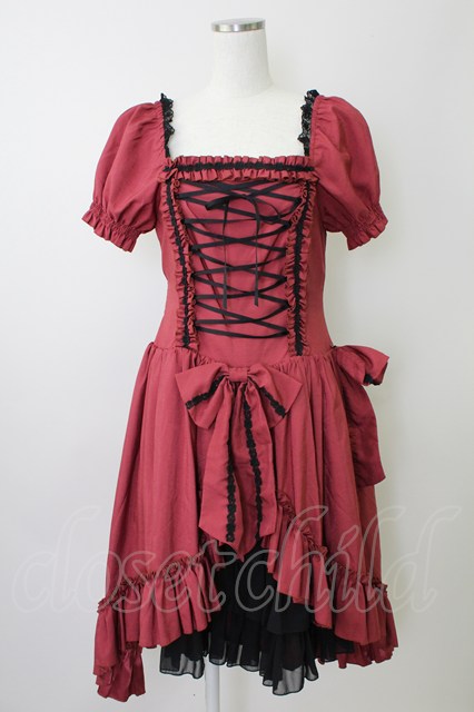 ATELIER PIERROT / 編み上げリボン半袖ワンピース ボルドーX黒 T-25-11-14-021-EL-OP-SA-ZI [戻る]