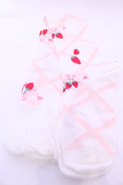 Lovely Tency / 眞白ありすコラボ/編み上げリボン風いちご柄オーバーニーソックス シロ×ピンク O-25-11-14-1052-LO-AC-OW-OS