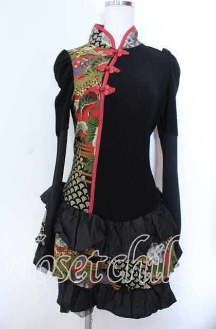 Qutie Frash / ちりめん和柄パフワンピース ブラック O-25-11-19-030-QU-OP-IG-OS