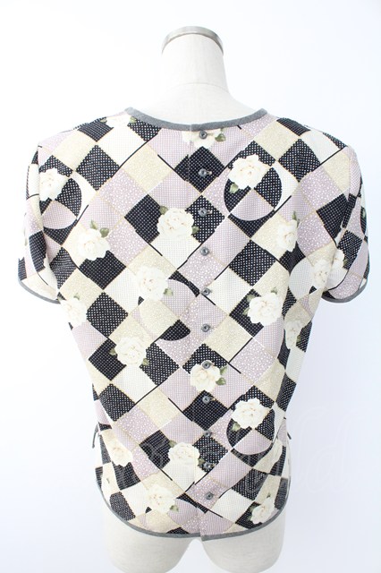 INGEBORG / カメリアひし形半袖ブラウス M 黒Xアイボリー T-25-11-28-010-LO-BL-SA-ZT221