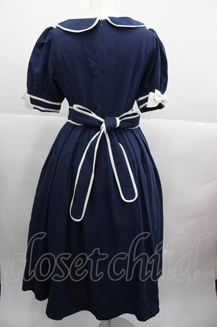 Bittersweet(海外ロリータブランド) / リボン半袖ワンピース S ネイビーX白 I-25-12-13-119-LO-OP-SA-ZI