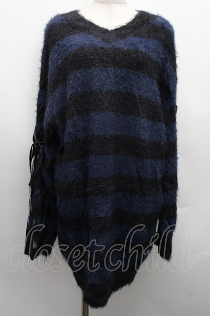 NOEMIE / おしゃれ囚人袖レースアップフェザーニット 紺x黒 S-25-12-15-015-LO-TO-AS-ZS