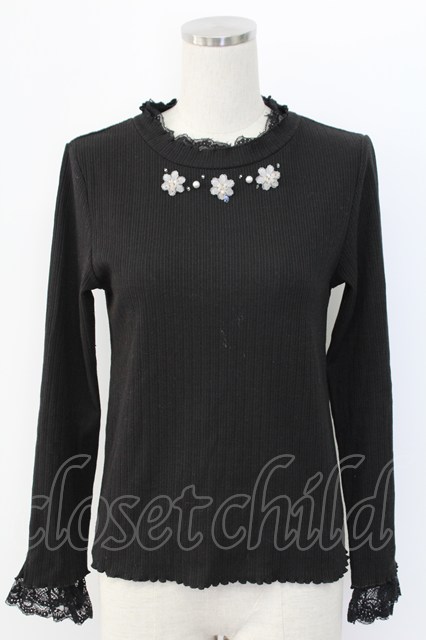 axes femme / キラキラお花ビジューリブプルオーバー ブラック T-25-12-18-003-AX-TO-SA-ZT