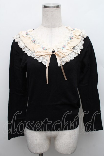 axes femme / 襟元バラ使いニットプルオーバー 黒 S-25-12-18-022-AX-TO-HR-ZS