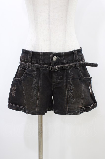Ozz Croce / ベルト付ダメージデニムショートパンツ ブラック H-25-12-26-011-OO-PA-KB-ZH
