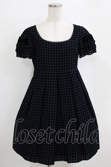 Emily Temple cute / フロッキーチェックフリルスリーブワンピース ネイビー H-26-01-06-013-ET-OP-KB-ZH