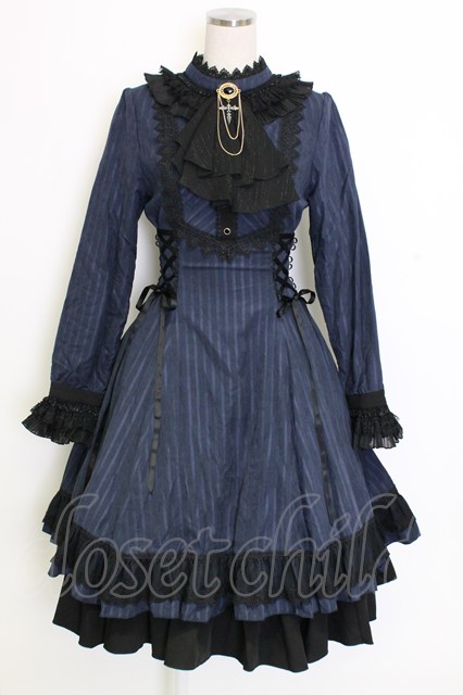 Miss Point / 立ち襟ビジュージャボ付きストライプワンピース ネイビーX黒 T-25-12-31-017-0-OP-SA-ZT