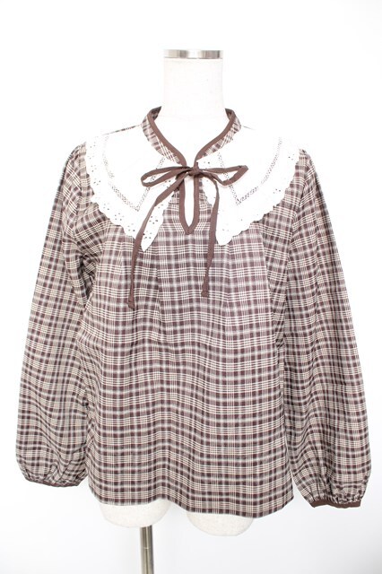 axes femme POETIQUE / レース襟チェックレトロブラウス 茶 Y-26-01-01-065-AX-BL-SZ-ZY