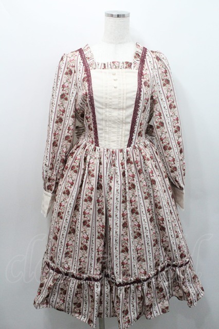 axes femme kawaii / ストライプローズ柄ワンピース アイボリーX赤 I-26-01-08-064-AX-OP-SA-ZI [戻る]