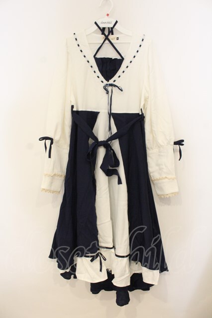 Favorite / はしごレースとリボンのFishTailワンピース M~L ネイビー×シロ O-26-01-10-051-LO-OP-OW-OS