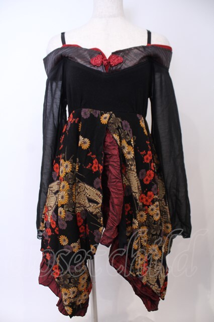 Qutie Frash / ちりめん着物袖チュニック ブラック×レッド系 O-26-01-28-056-QU-JA-IG-OS