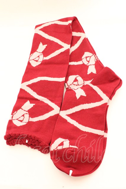 BABY,THE STARS SHINE BRIGHT / レースアップリボン柄オーバーニーソックス えんじ×ピンクリボン O-26-01-30-070-BA-ZA-OW-OS