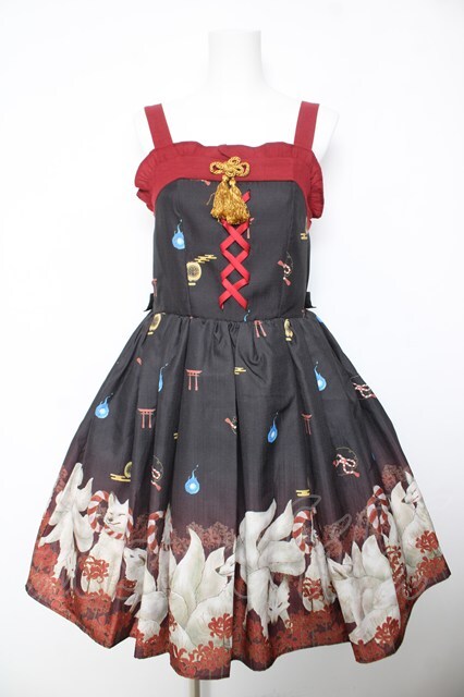 axes femme kawaii / 彼岸の白狐会柄ジャンスカ M 黒 Y-26-02-05-084-AX-OP-SZ-ZY