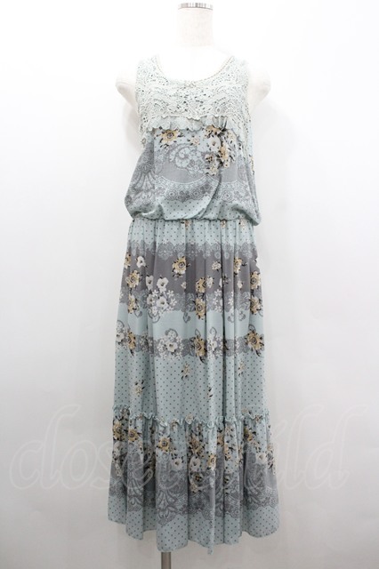 axes femme / フラワー&レースドットプリントノースリーブワンピース ミントXグレー I-26-02-08-065-AX-OP-SA-ZI