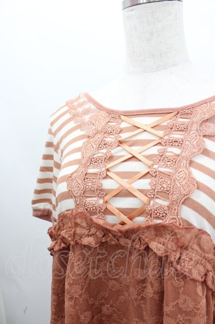 axes femme / ボーダーレース切り替え半袖カットソー オレンジX白 I-26-02-11-063-AX-TO-SA-ZI