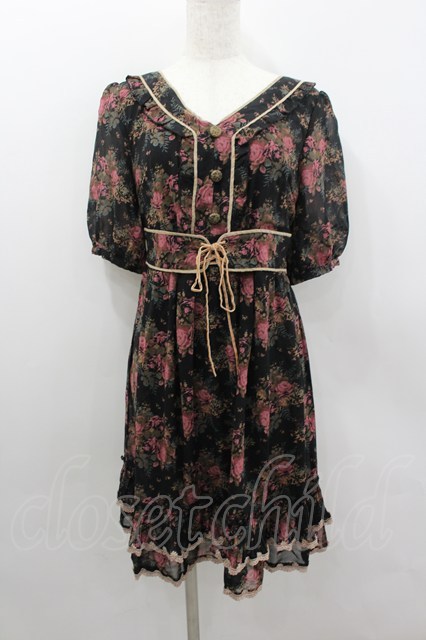 axes femme / 薔薇ブーケプリントウエストベルトデザインワンピース 黒XピンクXブラウン I-26-02-11-124-AX-OP-SA-ZI [戻る]