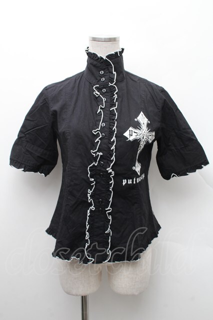 PUTUMAYO / 立ち襟クロスプリント半袖ブラウス 黒x白 S-26-02-11-038-PT-BL-HR-ZS