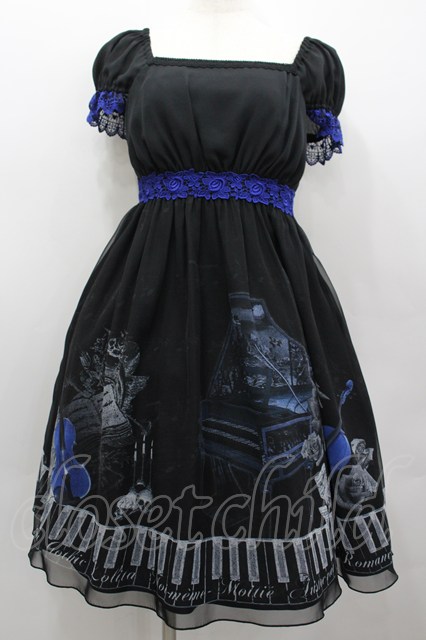 Moi-meme-Moitie / チェンバロ三重奏プリントシフォン半袖ワンピース 2 黒×青 I-26-02-13-102-MO-OP-TE-ZI
