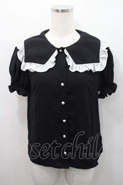 Jamie エーエヌケー / スクエアフリル襟半袖ブラウス 黒X白 I-26-02-15-049-LO-BL-SA-ZI
